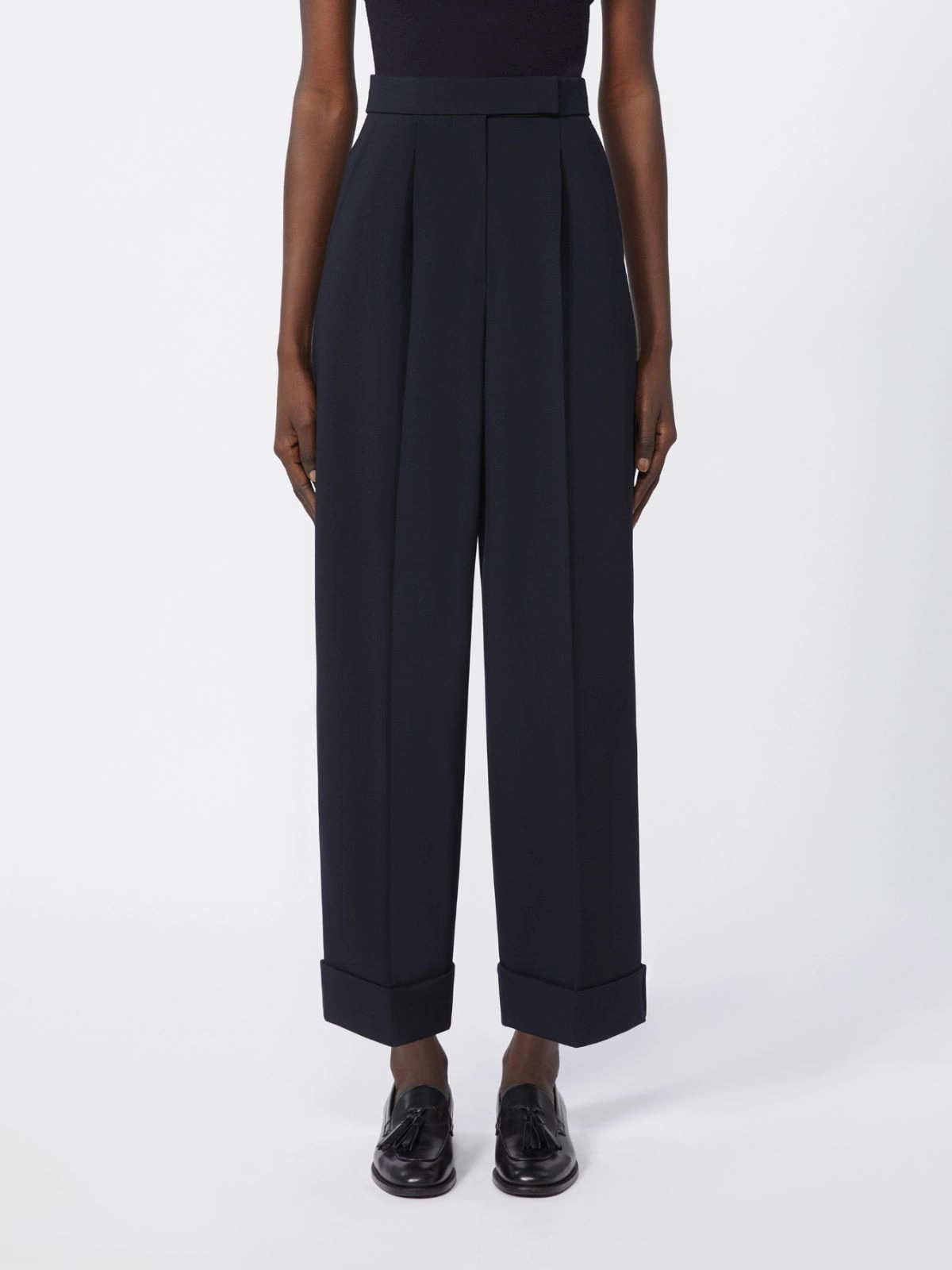 High-waisted trousers with turned-up hem, cropped above the ankle.