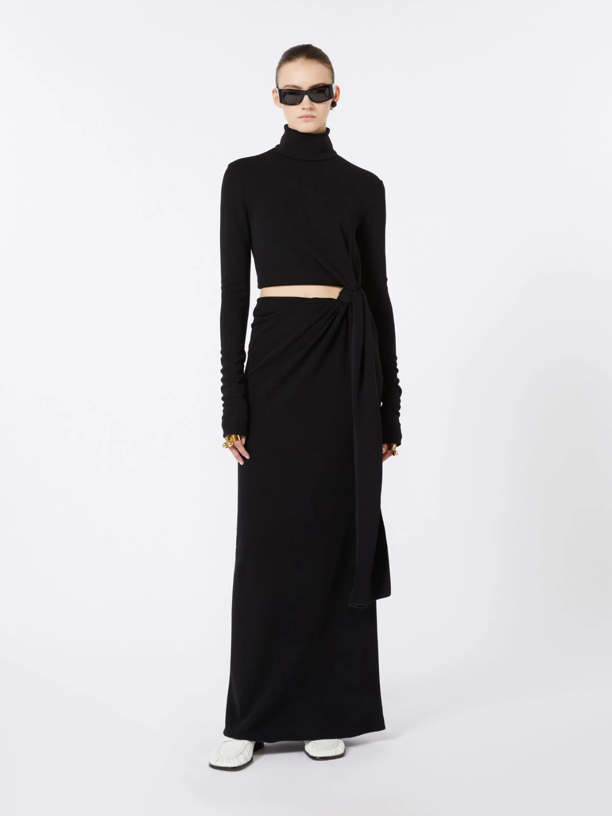 Long-sleeved dress with slightly raised neckline. The top and midi skirt are connected by a knot, leaving the waist uncovered.