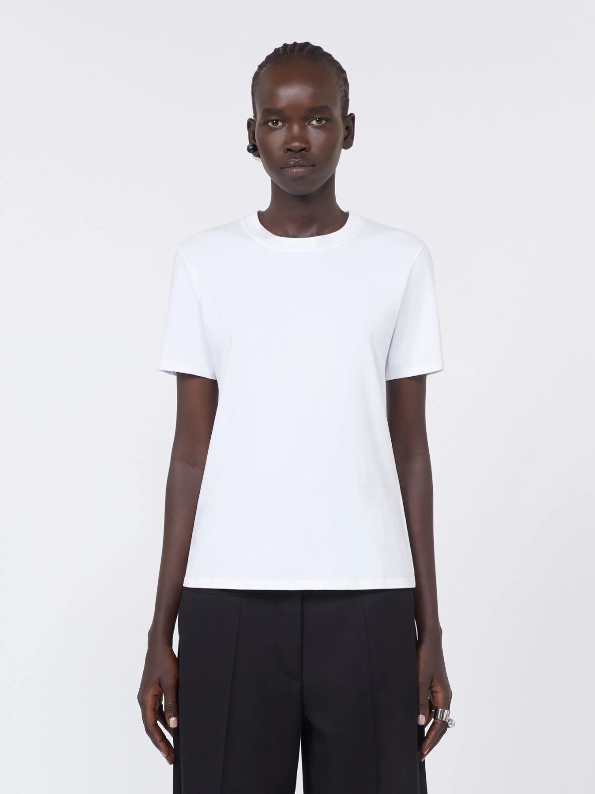 T-shirt in silk-feel stretch-cotton jersey. Regular cut, with rounded, rib-trim neckline and short sleeves.